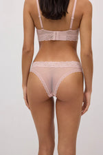 Mutandine brasiliane con plumeti e dettagli in pizzo. Un capo che unisce eleganza e cibo. Colore rosa. Abbinalo a un reggiseno coordinato e crea il look perfetto!